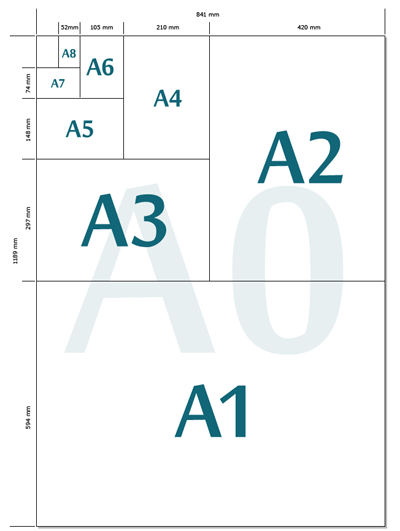 Hoe lager het getal (bijvoorbeeld A1) hoe groter het formaat. Elk volgend getal is de helft kleiner. Zo is A5 de helft van A4 en A4 is de helft van A3. Hieronder is dat te zien.
