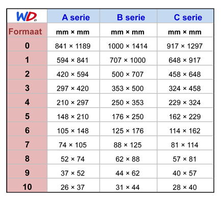 Formaten papier Het meest bekende formaat is het standaard A4 printerpapier. Er zijn ook B en C maten. Dit zijn de internationale formaten. Hieronder zie je een overzicht van de verschillende maten.